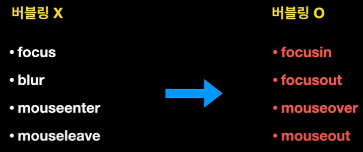 - 이벤트 버블링을 막아야하는 경우는 드물어서 이걸 사용하는 일도 드물다