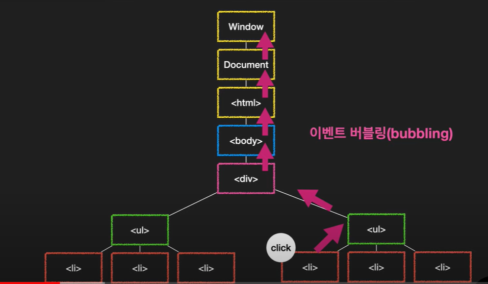 자식요소에서 발생한 이벤트 객체는 부모와 그 부모를 통해 전파 (하위요소에서 상위요소로 올라감)