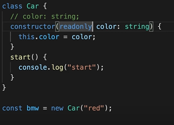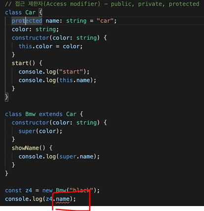 바로 위의 코드에 readonly name: string = "car"로 바꾸고 z4.name = "zzzz4"; 입력시 에러뜸