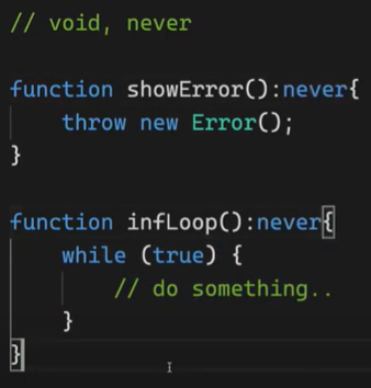 - never : 항상 에러를 반환하거나 영원히 끝나지 않는 함수의 타입