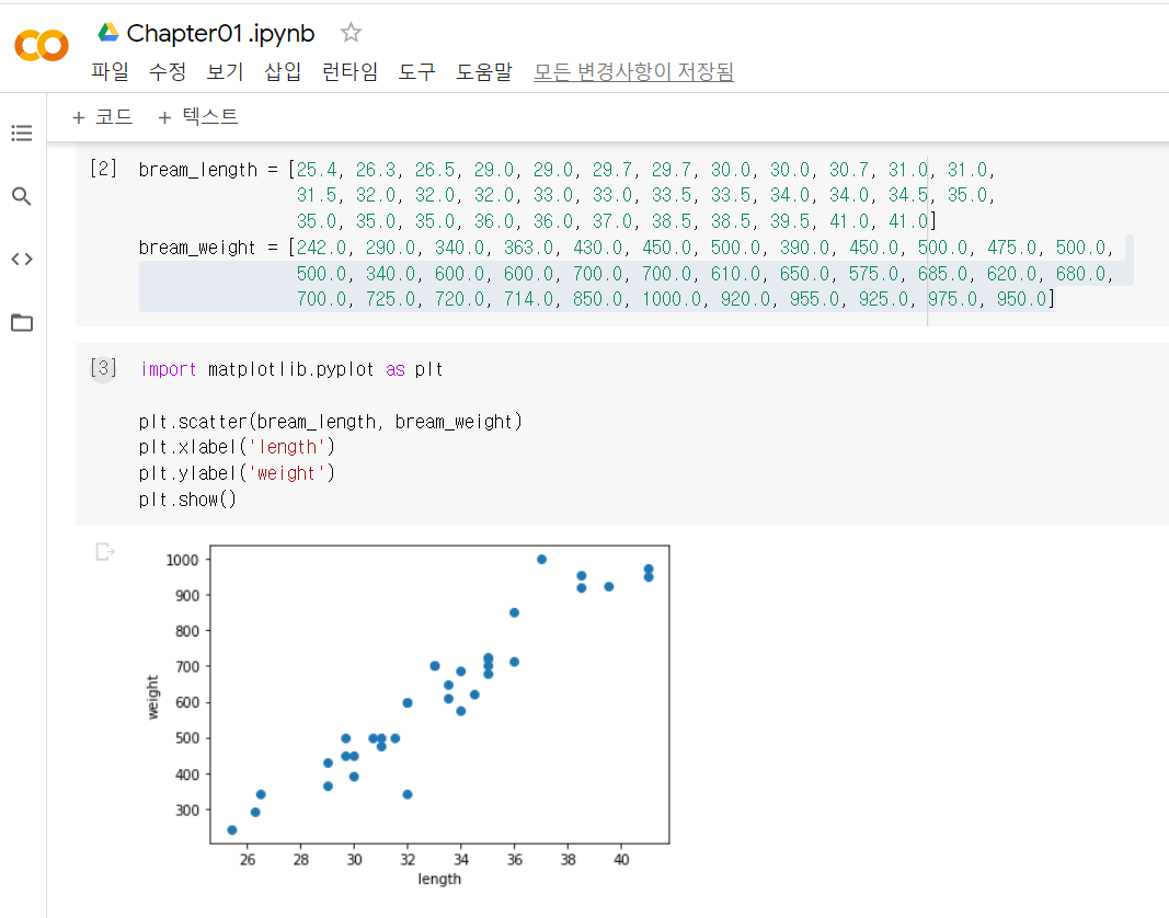 도미와 빙어 데이터를 가져와 코랩에서 그래프를 그려보았다.
