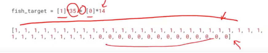 - 어떤게 도미이고 어떤게 빙어인지 안알려주면 머신러닝이 제대로 처리 못하기 때문에 뭐가 뭔지 알려주는 코드가 필요하다
