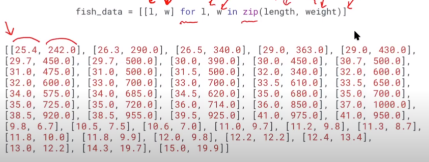 fish_data = [[l, w] for l, w in zip(length, weight)]