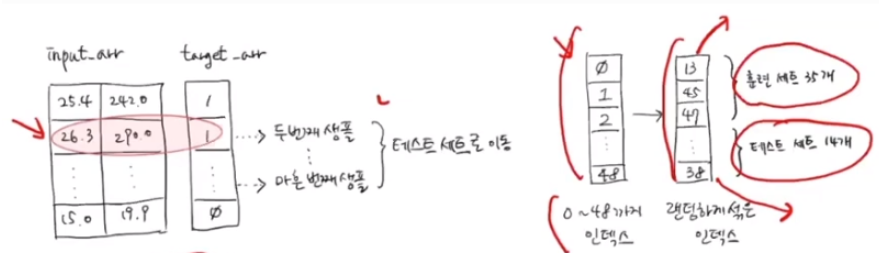 - 하지만 위에 처럼 데이터를 나눠서 하게 되면 훈련세트에는 도미만 들어가고 테스트 세트에는 빙어만 들어가 잘못도니 훈련 데이터가 만들어질 수 있다