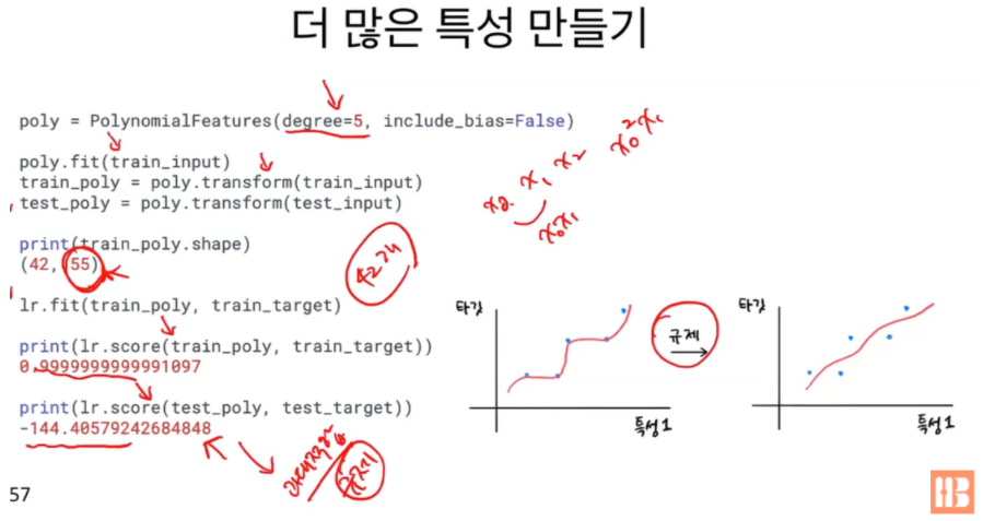 - degree를 5로 늘려서 만들면 train_poly.shape에서 55개의 특성으로 늘어난 것을 볼 수 있음