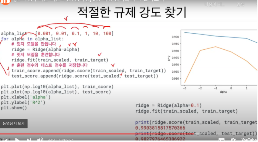 → 왼쪽으로 갈 수록 과대적합, 오른쪽으로 갈 수록 과소적합되어, 가장 간격이 좁은 -1인 10의 -1인 0.1 을 alpha값으로 준거임