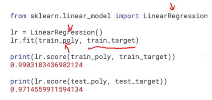 - 하지만 사이킷런의 선형 모델은 자동으로 절편을 추가하므로 굳이 이렇게 특성을 만들 필요가 없다 → include_bias = False로 지정해 다시 특성 변환