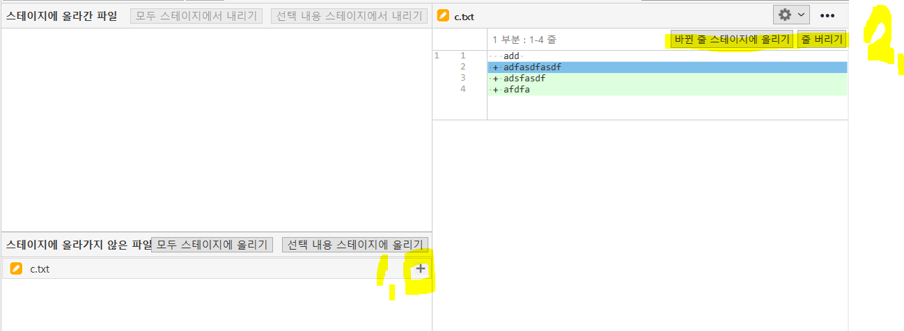 - 1. 파일 앞에 있는 checkbox로 staged area로 이동 가능